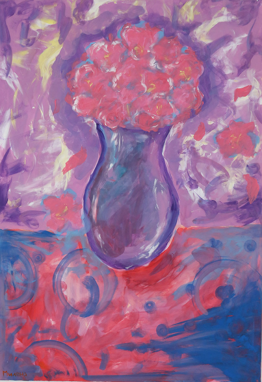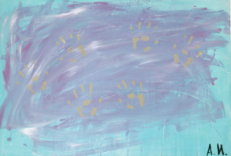 Детската невиност има слобода на изразување преку боја и допир. Како деца живееме во свет на фантазија, соништа и внатрешен мир, во пурпурен виор, заштитени од надворешниот свет. Трагата што ја оставаме во светот е безгрижна, искрена и незаборавна. Секое дете во себе носи светлина и убавина, само треба да му дозволиме да блесне.