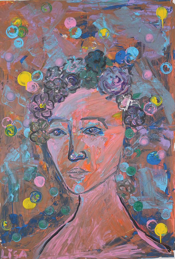 Сликата ја отсликува сложеноста на човечките емоции преку ликот на жена чиј поглед е длабок и полн со некажани чувства. Секој круг претставува различна емоција — тага, среќа, надеж, љубов. Изразот на девојката е сериозен, но во себе крие длабока мисла и внатрешна борба. Цветовите во косата ја претставуваат желбата за убавина и мир дури и во хаос. Палетата на бои и динамичните потези покажуваат како емоциите можат да се испреплетат и судрат. Оваа слика е визуелна приказна за внатрешниот свет кој не секогаш се гледа однадвор.