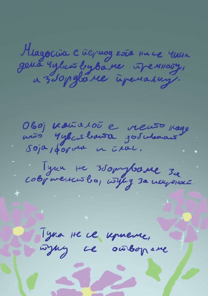 Се чувствував како да сум замрзнатa, ама и како да врие нешто во мене. Ми требаше начин да кажам „овде сум“, без зборови. Ова не е само слика. Ова сум јас кога никој не гледа. И верувам дека не сум сама во тоа.